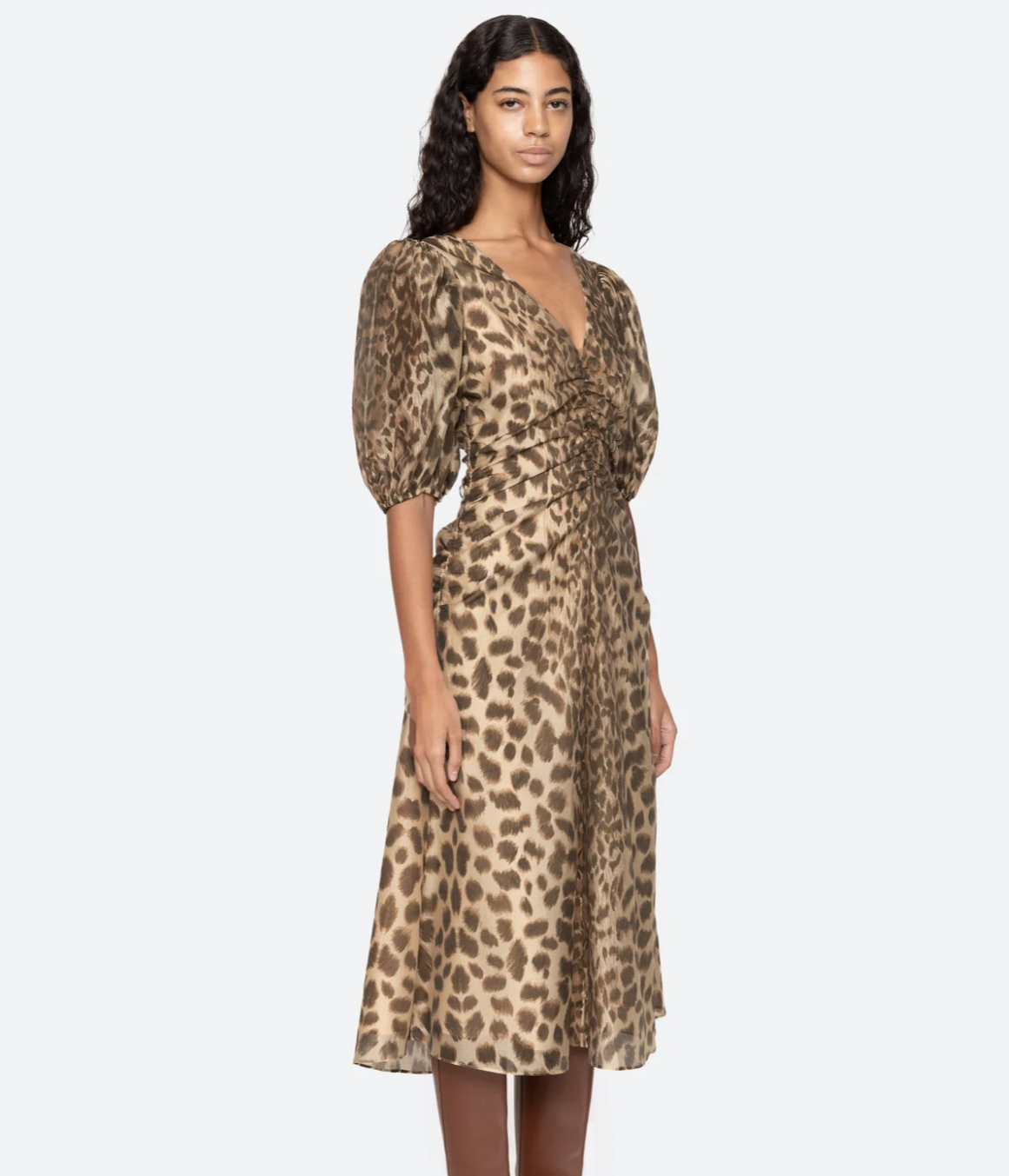 The Claude leopard print dress is a feminine midi-length piece that combines timeless design with a bold animal print. Featuring a flattering v-neckline, puff sleeves, and a ruched bodice, this dress creates a beautifully sculpted silhouette, making it perfect for both day and evening wear.
