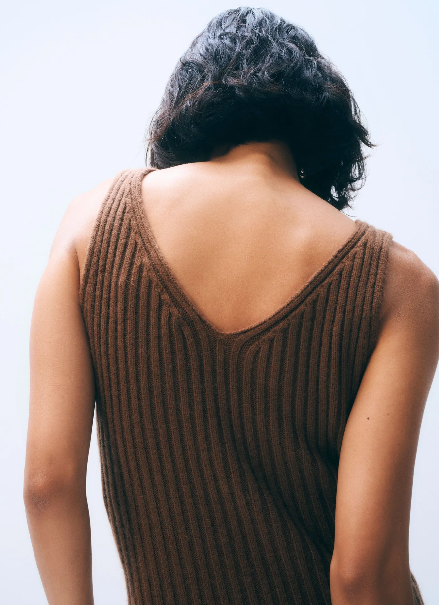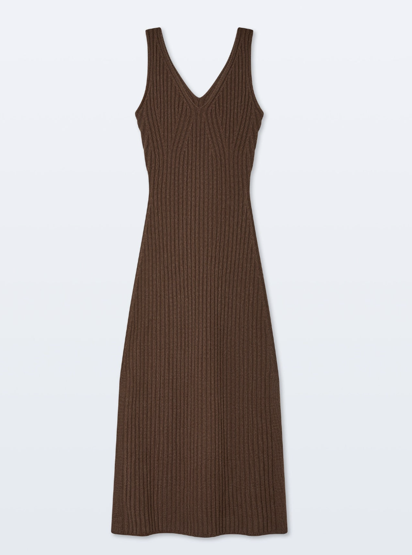 Sleek and structured. This wool‑cashmere midi dress combines a slim rib‑knit fit, side slits, and a softly defined drape for all‑day wearability.