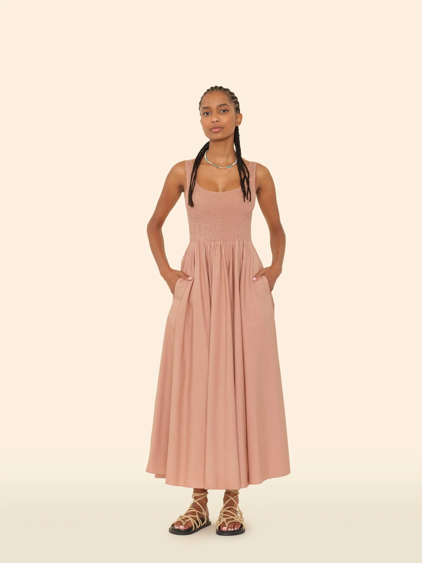 Pretty Please. Florence is made in our new crisp paper poplin with a refined feel. This sleeveless midi sundress features a square neck, smocked bodice, and side seam pockets.