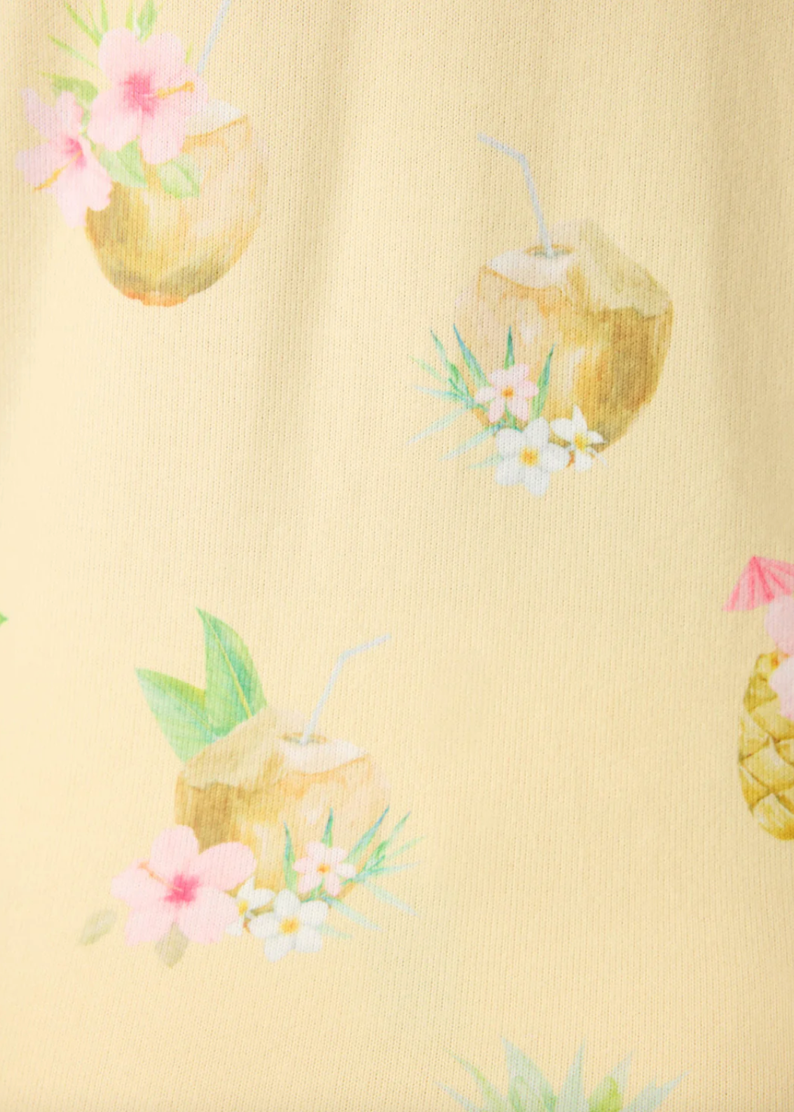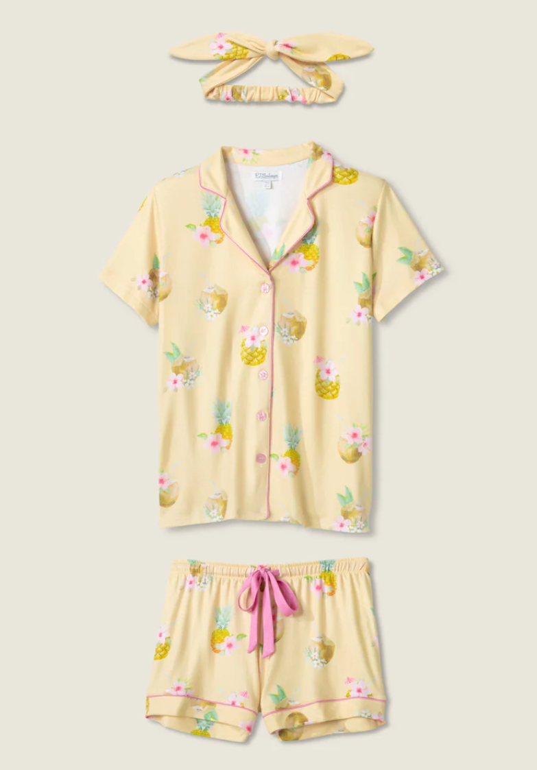 Vacation state of mind, activated. This button-up PJ set is crafted from our butter jersey with a weighty handfeel for a smooth, comfy drape and a hint of stretch. The tropical cocktail and floral print adds playful island vibes, while pink piping and a contrast drawstring deliver a splash of polish. With its relaxed fit and soft feel, it's a sunshine-soaked dream for winding down or waking up slow.