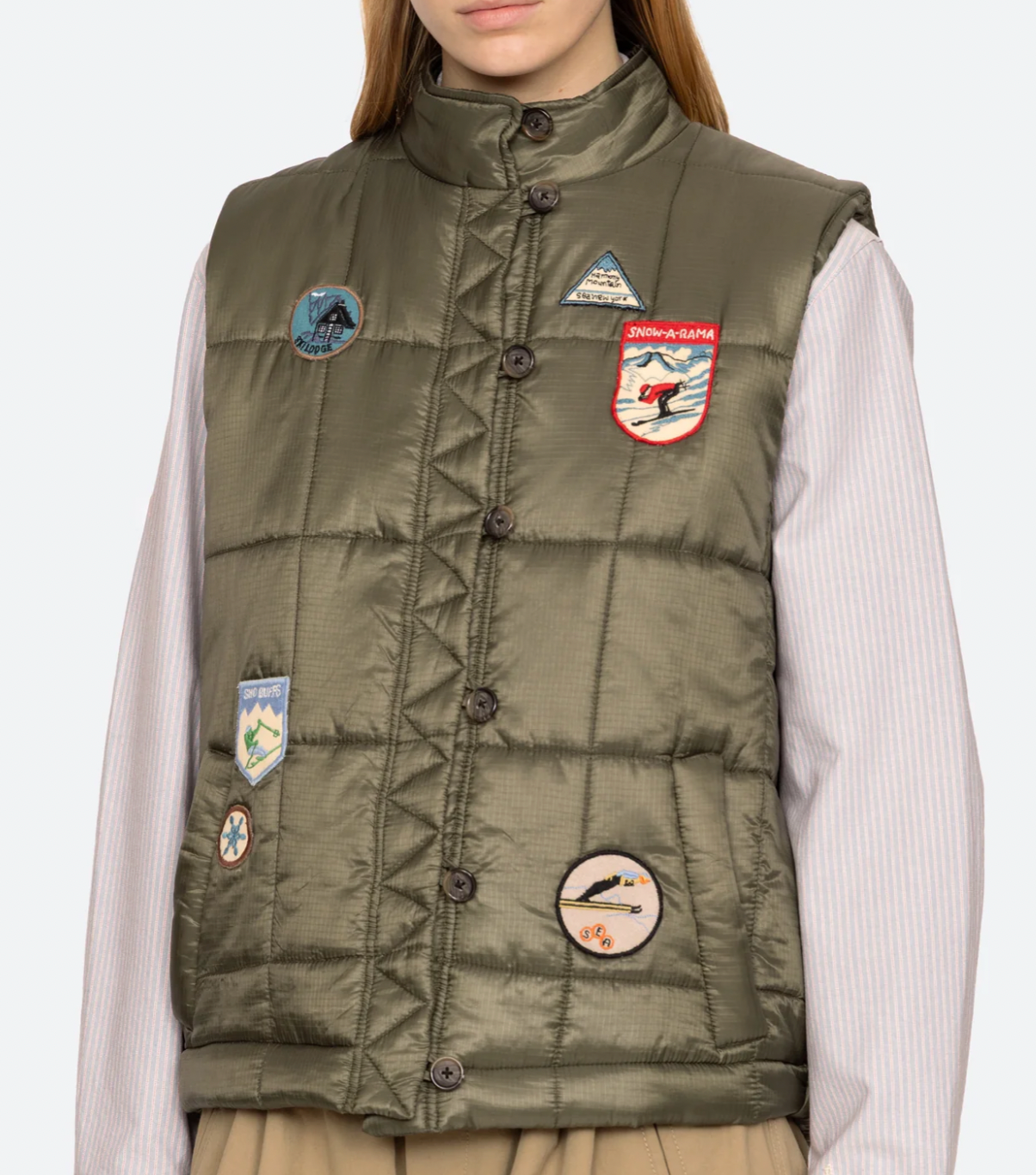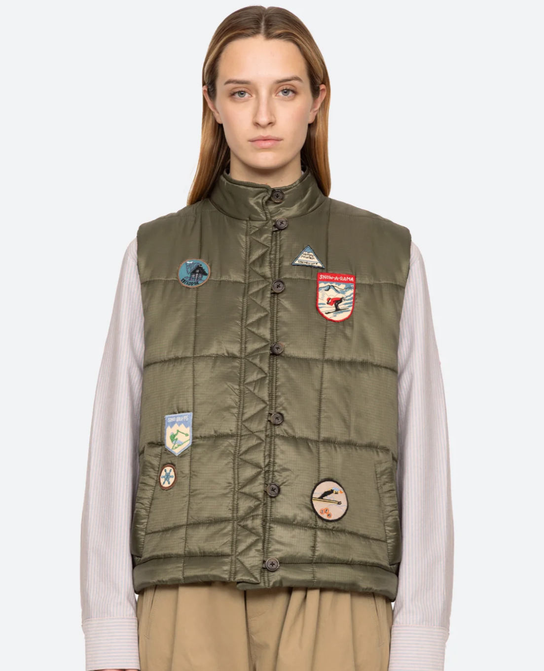 The Eira quilted puffer vest reimagines utilitarian style with a playful spirit, featuring custom ski-inspired 'Sea' patches, a high neck, and a streamlined silhouette for a modern alpine aesthetic.