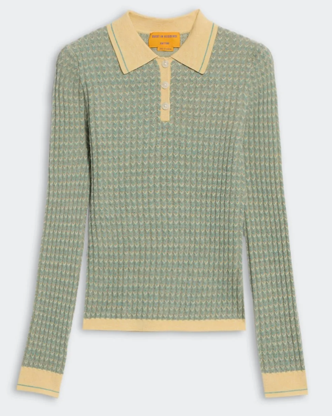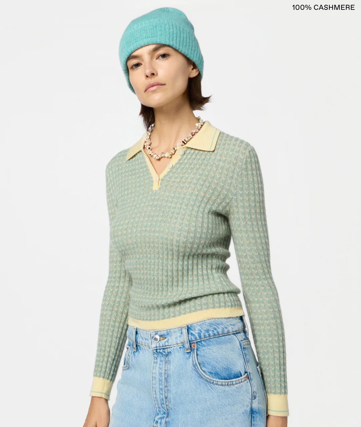 The Chevron LS Shrunken Polo sweater is crafted from 100% featherweight cashmere with a slim, modern fit. Designed with a ribbed polo collar, long sleeves, and fine chevron striping, this women’s cashmere polo is perfect for layering or wearing on its own.