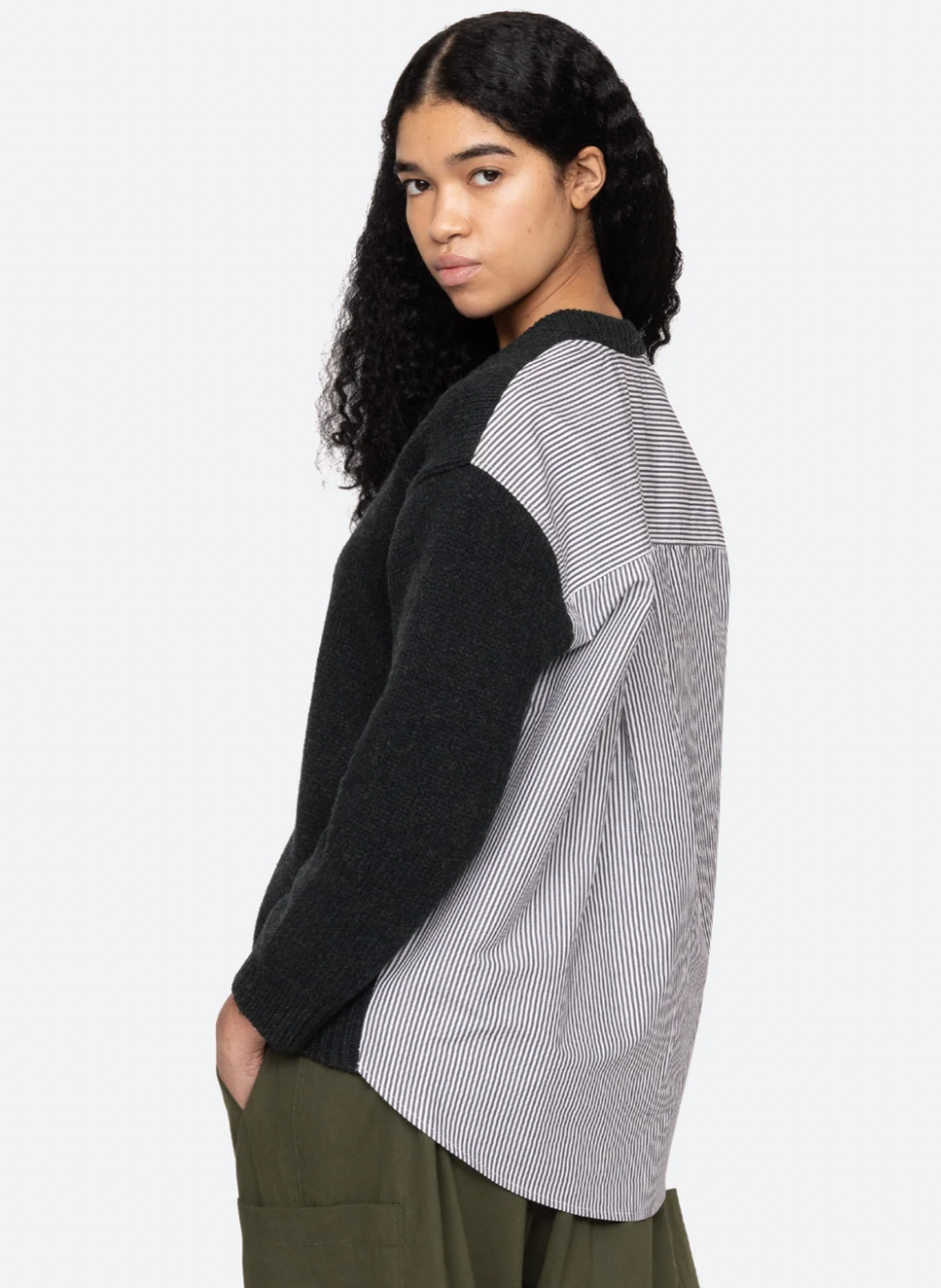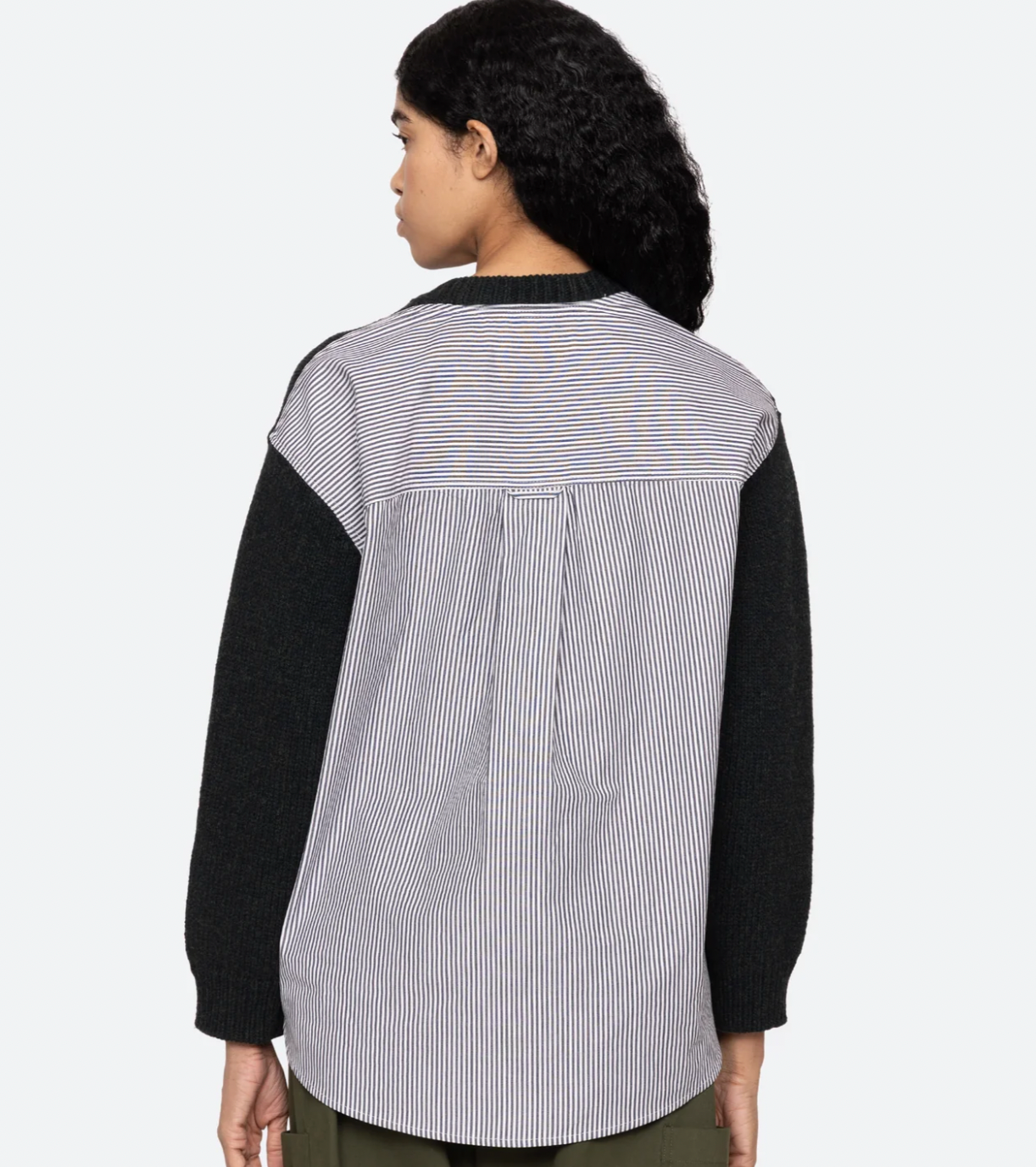 The Mallory v-neck combo sweater blends textured and contrast with a knit body, ribbed detailing, and a crisp striped shirting back. Finished with a flattering v-neckline, it offers a polished yet effortless look.